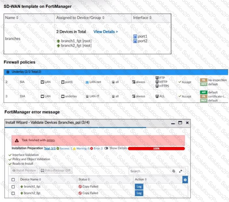 You use FortiManager to manage the branch devices and configure the SD-WAN template. You have configured direct internet access (DIA) for the IT department users. Now. you must configure secure internet access (SIA) for all local LAN users and have set the firewall policies as shown in the second exhibit.