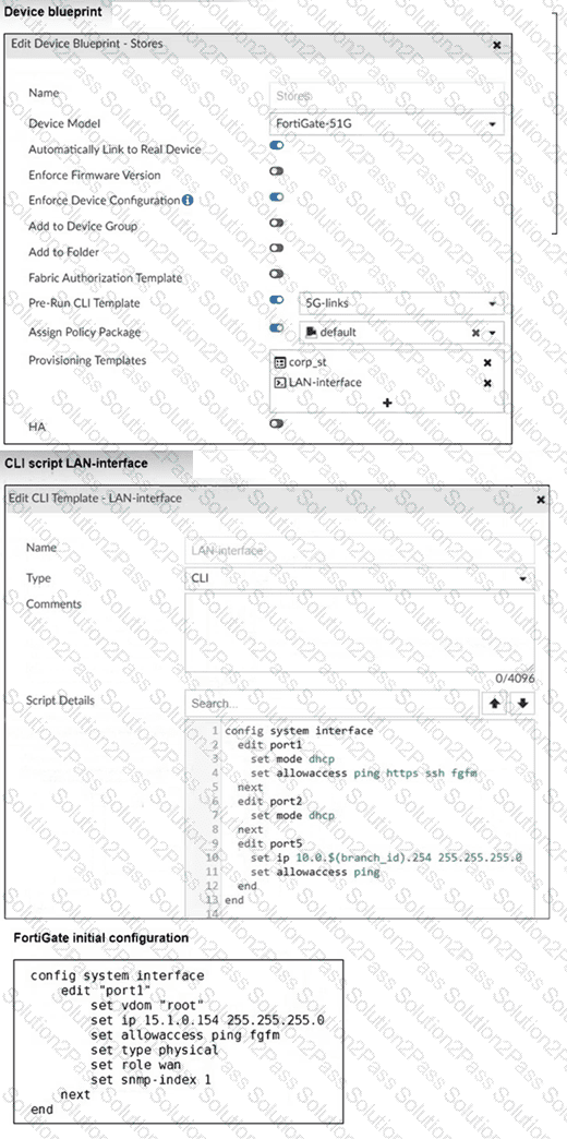 To prepare to onboard FortiGate devices to your company's stores, you configure the device blueprint and CLI scripts shown in the exhibit. Then, a technician prepares a FortiGate 90G with a basic configuration and connects it to the network. The basic configuration contains the port1 configuration and the minimal configuration required to allow the device to connect to FortiManager.