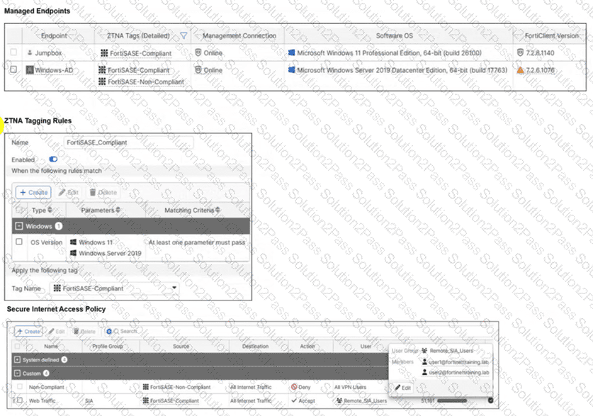 Jumpbox and Windows-AD are endpoints from the same remote location. Jumpbox can access the internet through FortiSASE, while Windows-AD can no longer access the internet. Based on the information in the exhibits, which reason explains the outage on Windows-AD? (Choose one answer)