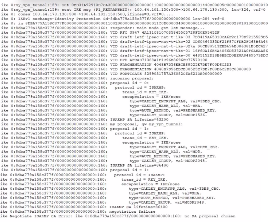 A customer is trying to restore a VPN connection configured on a FortiGate. Exhibits show output during a troubleshooting session when the VPN was working and the current baseline VPN configuration.