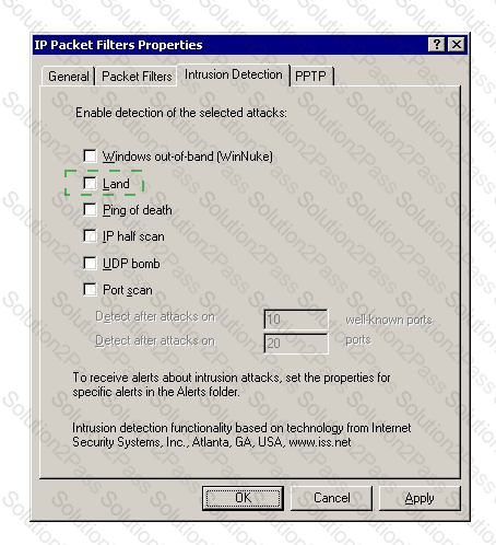 You work as a Network Administrator for McRobert Inc. The company's Windows 2000-based network is configured with Internet Security and Acceleration (ISA) Server 2000. You are configuring intrusion detection on the server. You want to get notified when a TCP SYN packet is sent with a spoofed source IP address and port number that match the destination IP address and port number. Mark the alert that you will enable on the Intrusion Detection tab page of the IP Packet Filters Properties dialog box to accomplish the task.