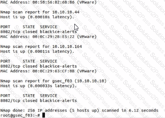 Use nmap to discover a host on the 10.10.10.0/24 network, scanning only port 8082 and using the SYN or Stealth scan approach. Which host has a service called -blackice-alerts"?