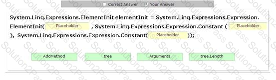 You need to create an ElementInit that represents calling Dictionary.Add(tree.Length, tree). Drag and drop the appropriate values to accomplish the task.