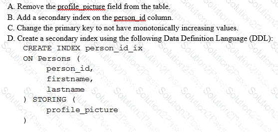 Your customer has implemented a solution that uses Cloud Spanner and notices some read latency-related performance issues on one table. This table is accessed only by their users using a primary key. The table schema is shown below.