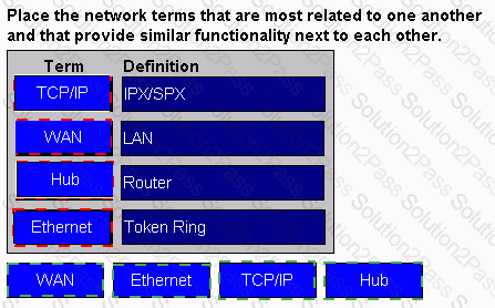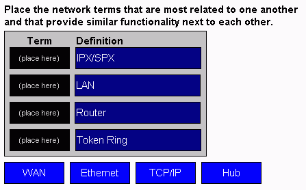 Click the Task button. Place the network terms that are most related to one another and that provide similar functionality next to each other. For instructions on how to answer a Drag and Drop question, click the Help button.