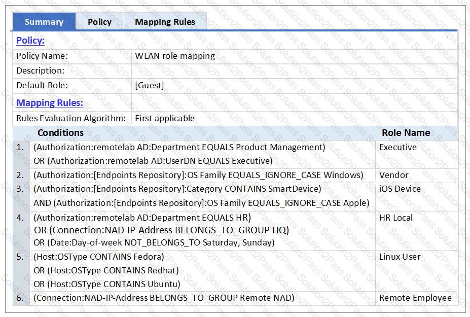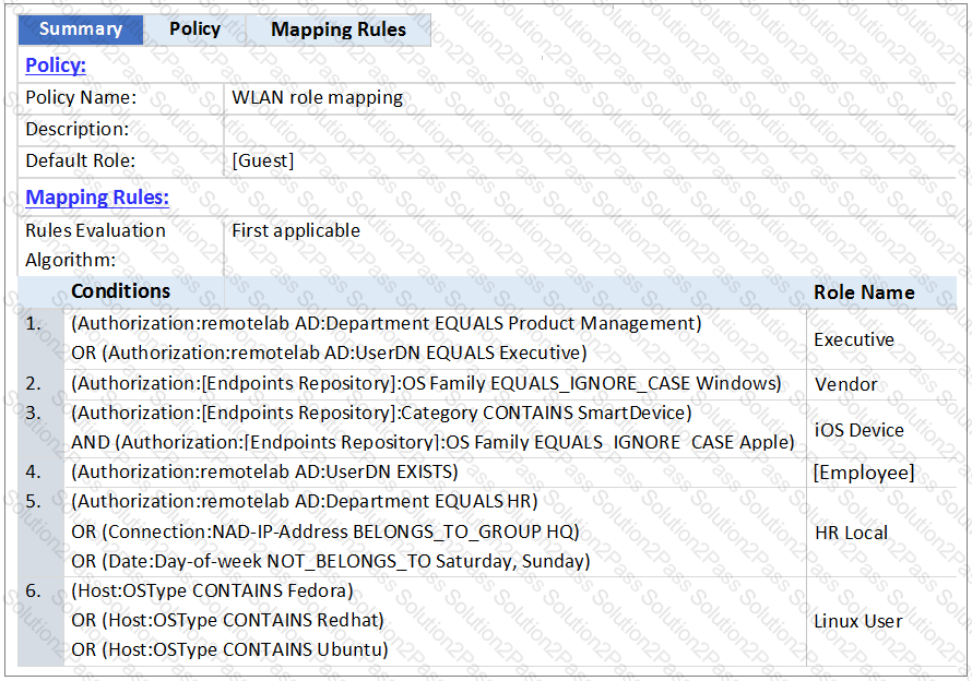 An AD user’s department attribute value is configured as “Product Management”. The user connects on Monday to a NAD that belongs to the Device Group HQ.