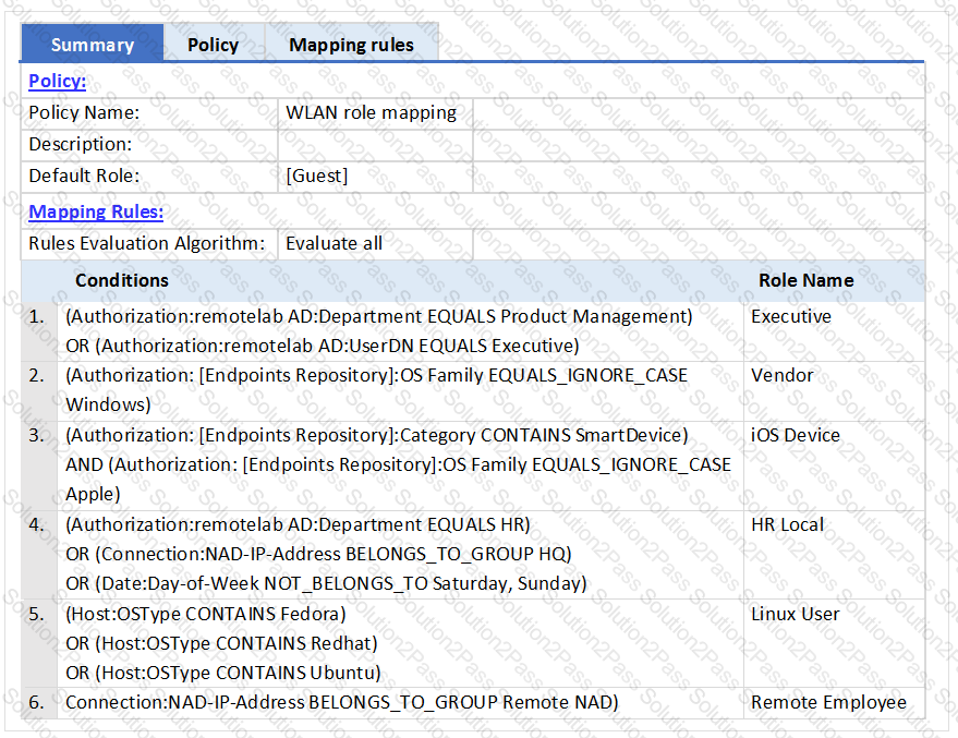 An AD user’s department attribute is configured as “HR”. The user connects on Monday using an Android phone to an Aruba Controller that belongs to the Device Group Remote NAD.