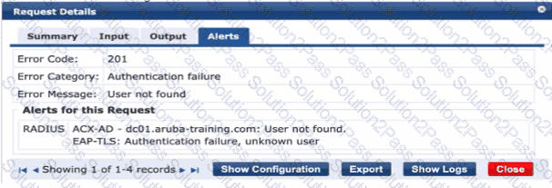 You configured" a bridged mode SSID with WPA3-Enterprise and EAP-TLS security. When you connect an Active Directory joined client that has valid client certificates. ClearPass shows the following error.