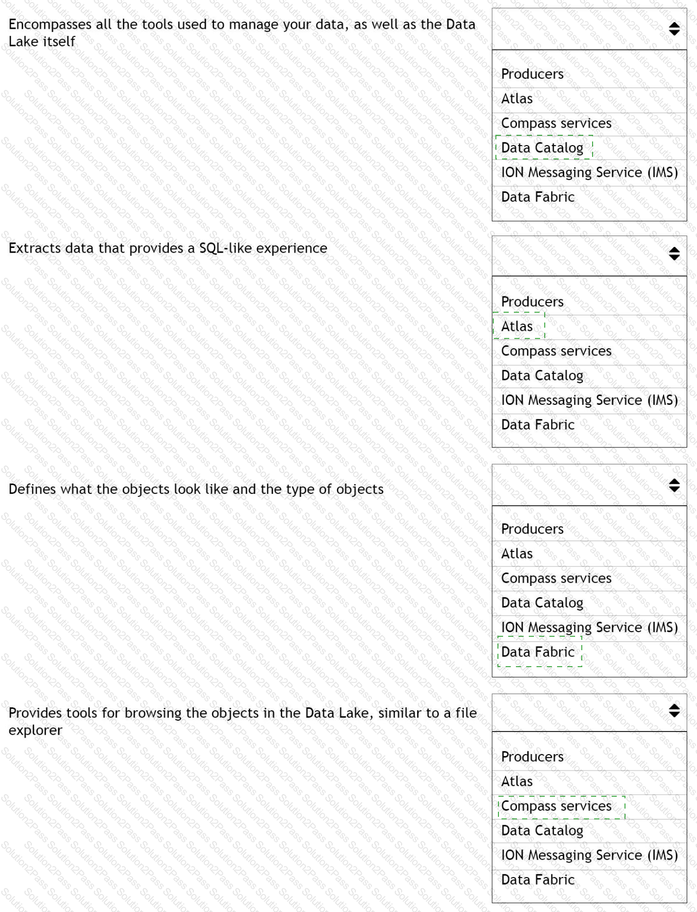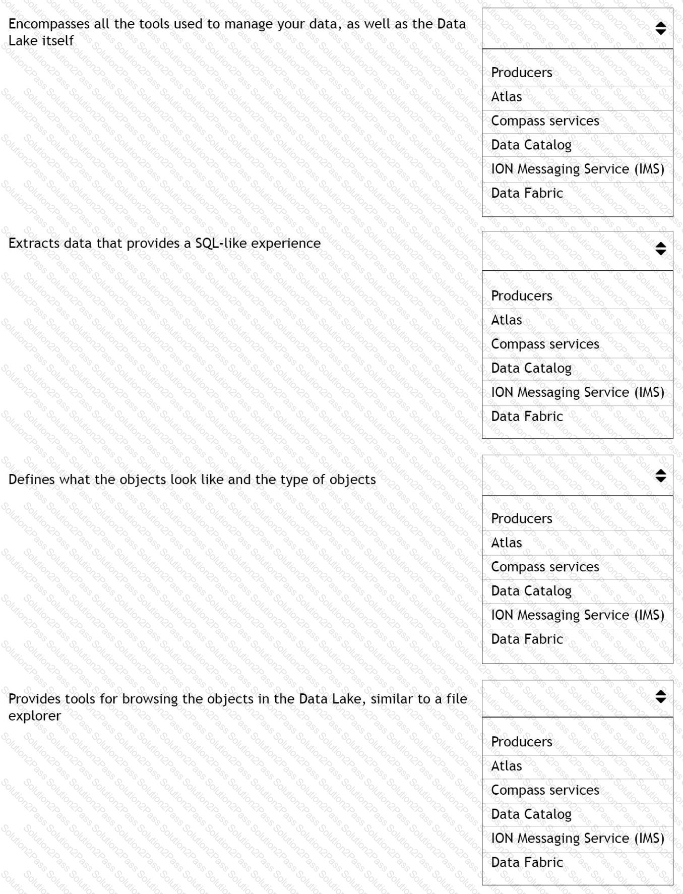 Select from the drop-down lists on the right, the Data Lake service that corresponds with each description on the left. Use an option only once, however, not all options will be used.