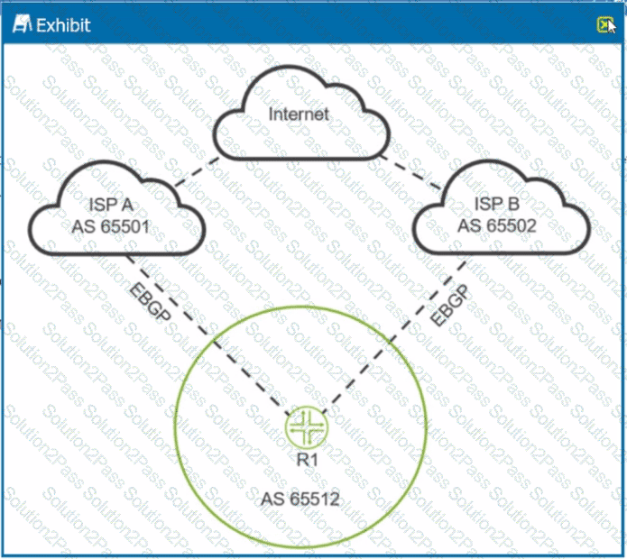 You are receiving the same BGP Internet routes on R1 from both upstream ISPs. You are asked to load-balance traffic destined to the Internet across both ISPs.