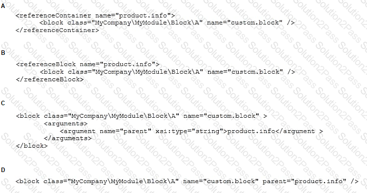 How do you set the custom block MyCompany\MyModule\Block\A as a child for the block named product.info using layout XML?