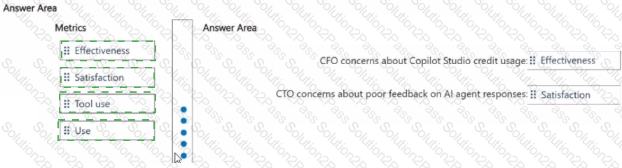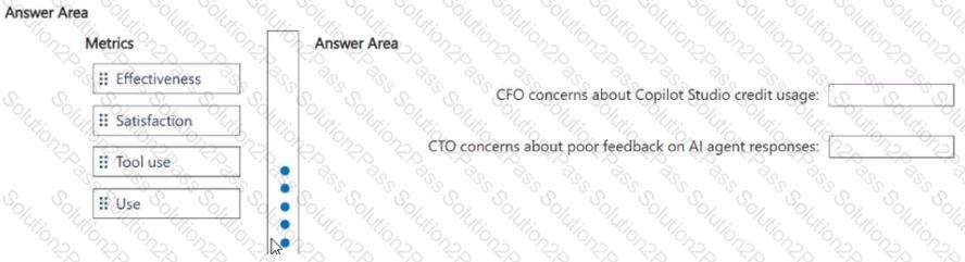 Which Copilot Studio analytics metrics should you recommend to assist the executives with their specific responsibilities? To answer, drag the appropriate metrics to the correct executives. Each metric may be used once, more than once, or not at all. You may need to drag the split bar between panes or scroll to view content.