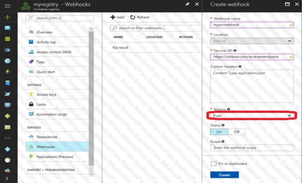 You need to ensure that the https://contoso.com/statushook webhook is called every time a repository named az40010480345acr1 receives a new version of an image named dotnetapp.