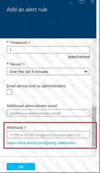You need to create a notification if the peak averageresponse time of an Azure web app named az400-9940427-main is more than five seconds when evaluated during a five-minute period. The notification must trigger the “https://contoso.com/notify” webhook.