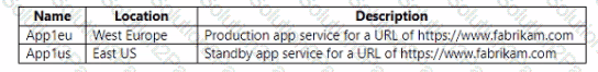 • If App1eu becomes unresponsive, all the traffic to https://www.fabrikam.com must be directed to App1us. You need to implement Traffic Manager to meet the requirements.