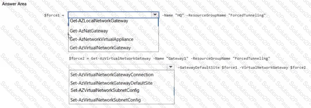 How should you complete the PowerShell script to configure forced tunneling? To answer, select the appropriate options in the answer area.