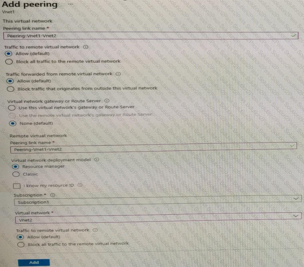 You have a peering connection between Vnet1 and Vnet2 as shown in the Peering-Vnet1-Vnet2 exhibit.