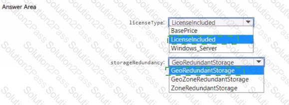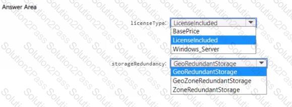 You need to specify the licenseType and storagenedundancy parameters. The deployment must meet the availability requirements and the business requirements for DB1 and DB2.