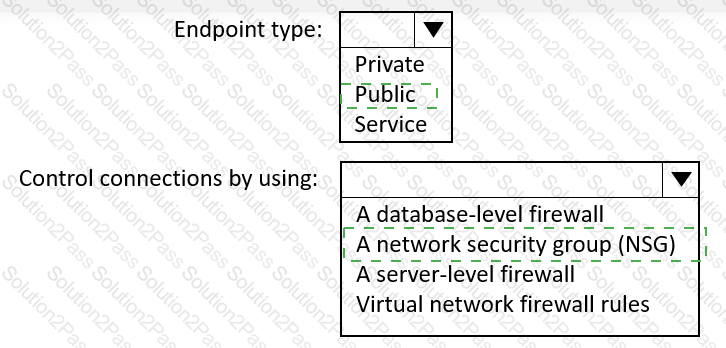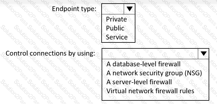 Which type of endpoint should you use for SQL1, and what should you use to control the connections to SQL1? To answer, select the appropriate options in the answer area.