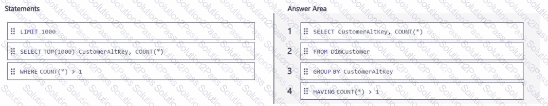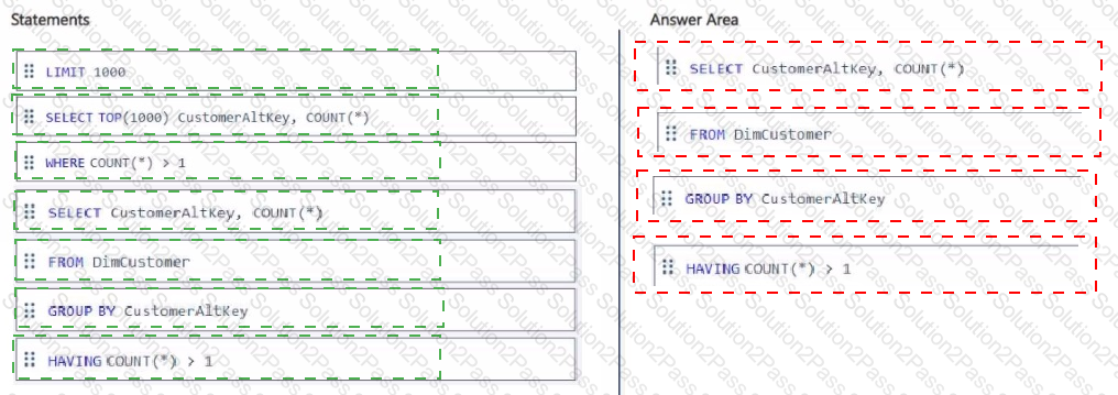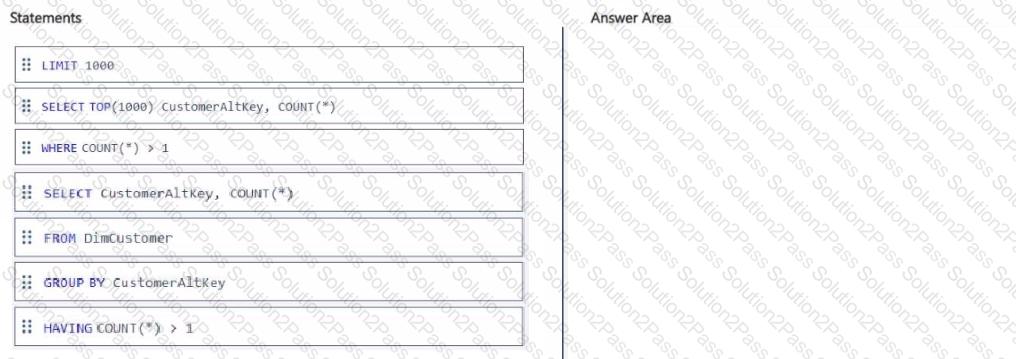You need to identify duplicate email addresses in DimCustomer. The solution must return a maximum of 1,000 records.