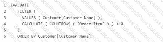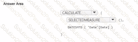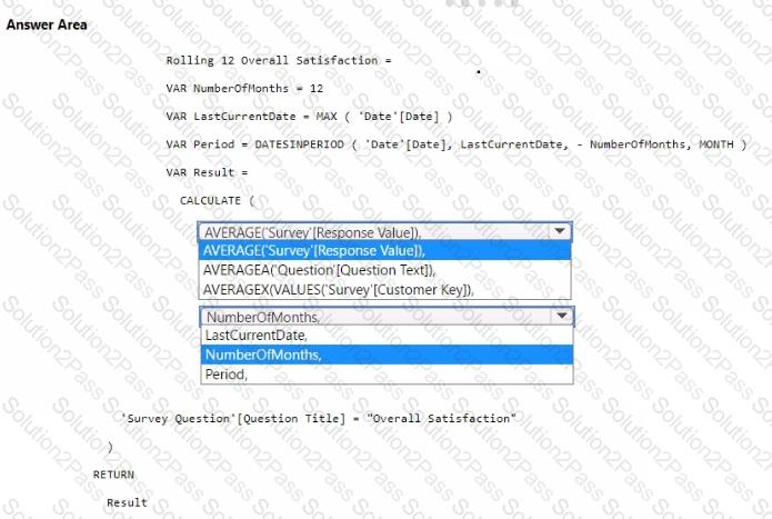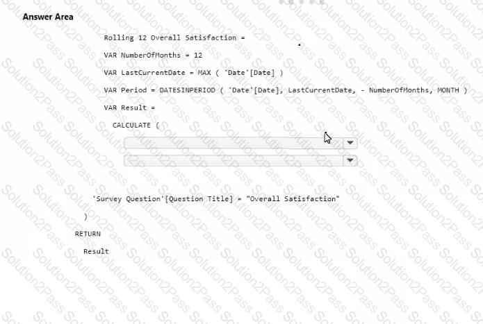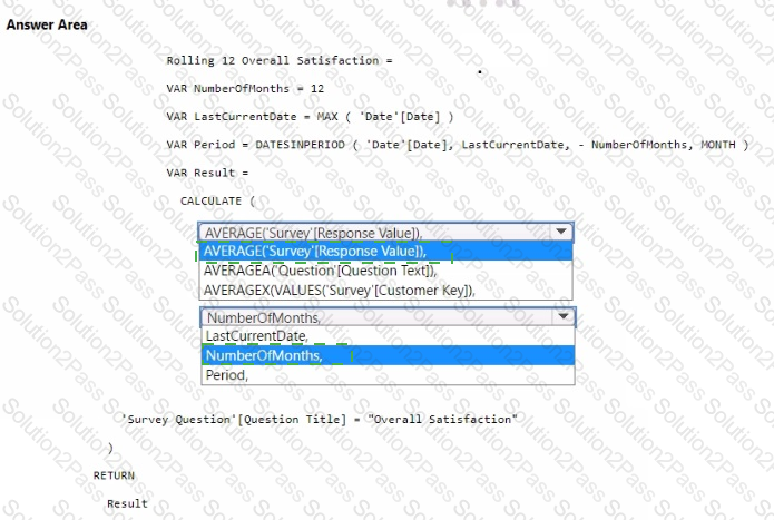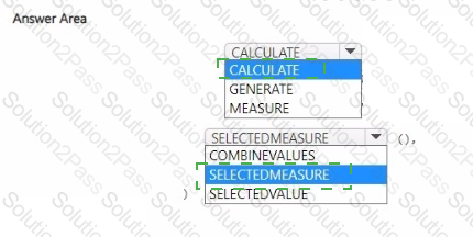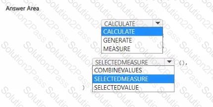 How should you complete the DAX code? To answer, select the appropriate options in the answer area.