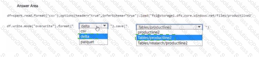 You need to migrate the Research division data for Productline2. The solution must meet the data preparation requirements. How should you complete the code? To answer, select the appropriate options in the answer area