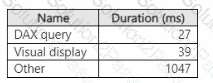 You open Performance analyzer and identify that a visual named Orders By Date is the slowest to render. The duration breakdown for Orders By Date is shown in the following table.