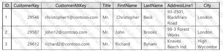 You have a Fabric tenant that contains a data warehouse named DW1. DW1 contains a table named DimCustomer. DimCustomer contains the fields shown in the following table.