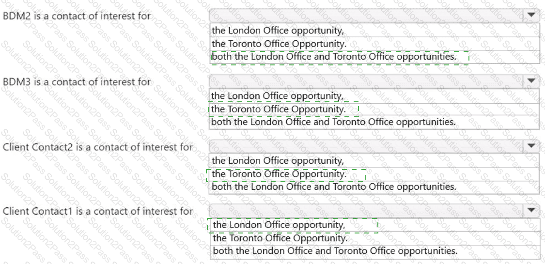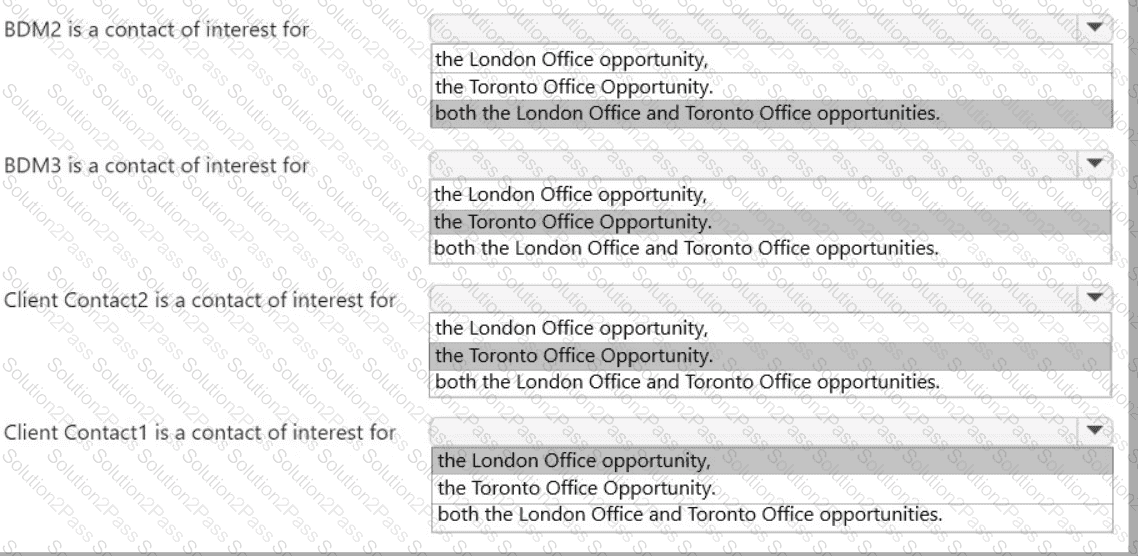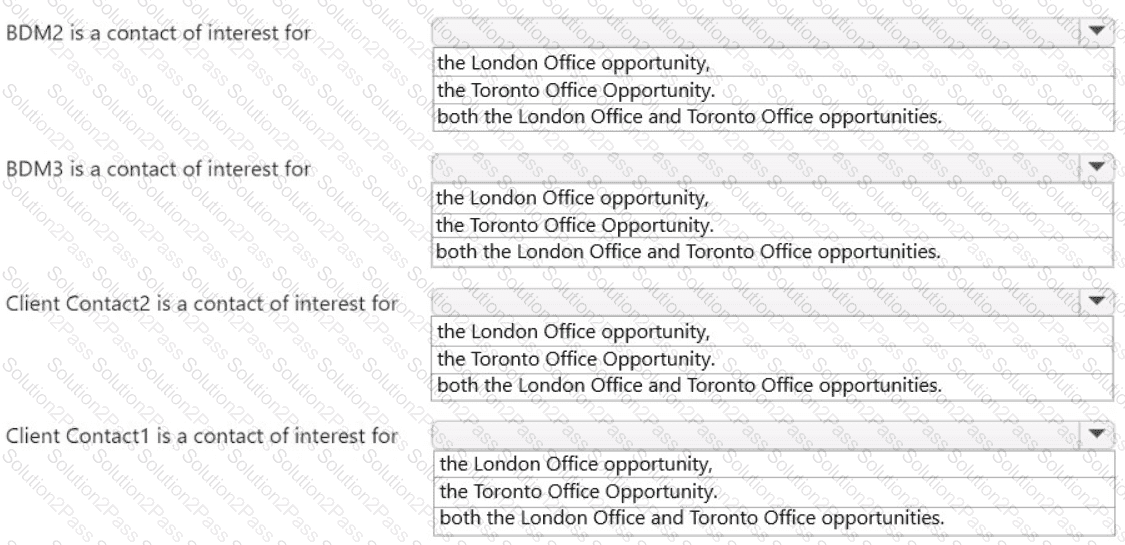 You need to help BDM3 understand which internal and external contacts are considered contacts of interest for relationship analytics KPI calculations for the two opportunities shown in the following exhibit.
