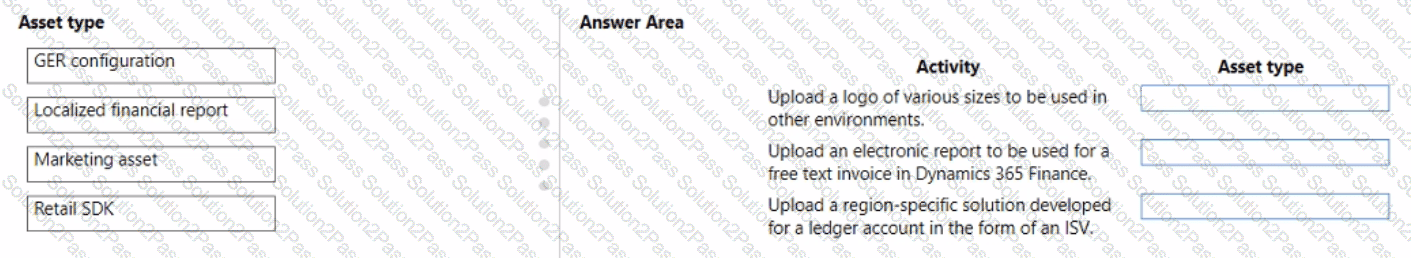 Which asset types should you use? To answer, drag the appropriate asset types to the correct activities. Each asset type may be used once, more than once, or not at all. You may need to drag the split bar between panes or scroll to view content.
