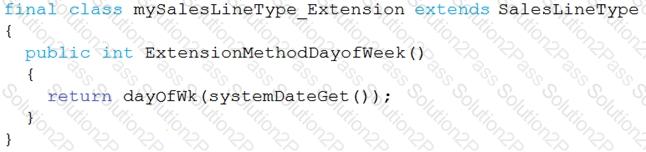 You must extend the class SalesLineType and add a new method that returns the day of week for the system’s current date as an integer value.