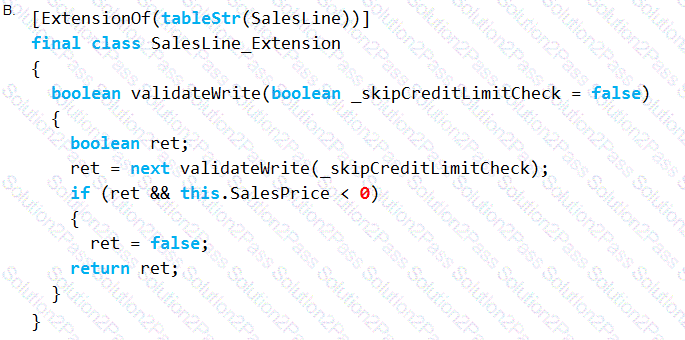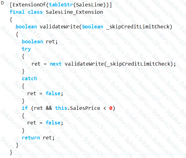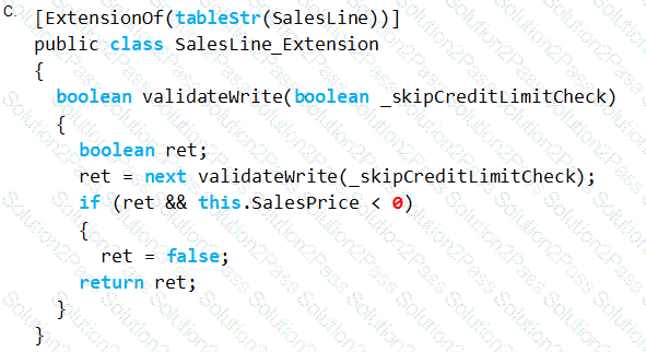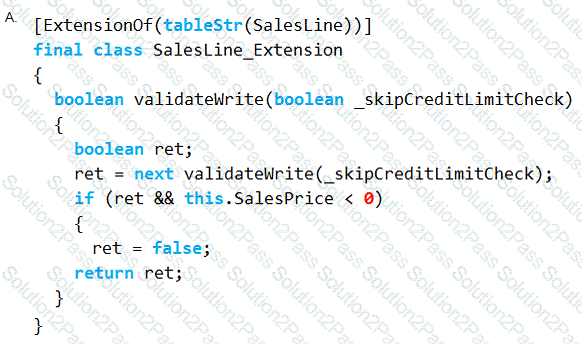 You must extend the validate method of the SalesLine table by using Chain of Command. The value of a variable named SalesPrice must be greater than or equal to zero when adding new lines.
