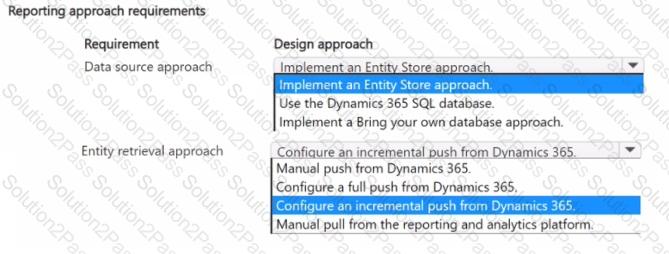 Which design approach should you use for each requirement? To answer, select the appropriate options in the answer area.