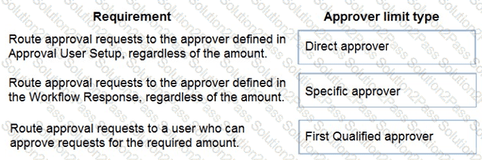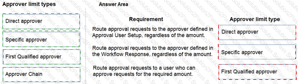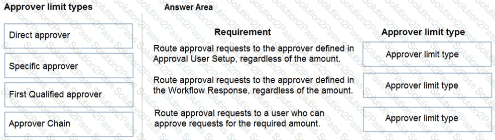 Which approver limit types should you use? To answer, drag the appropriate approver limit types to the correct requirements. Each approver limit type may be used once, or not at all. You may need to drag the split bar between panes or scroll to view content.