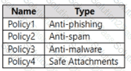 You have a Microsoft 365 E5 subscription that uses Microsoft Defender for Office 365. You have the policies shown in the following table.