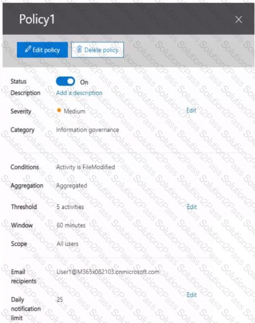 You have a Microsoft 365 tenant that contains two users named User1 and User2. You create the alert policy shown in the following exhibit.