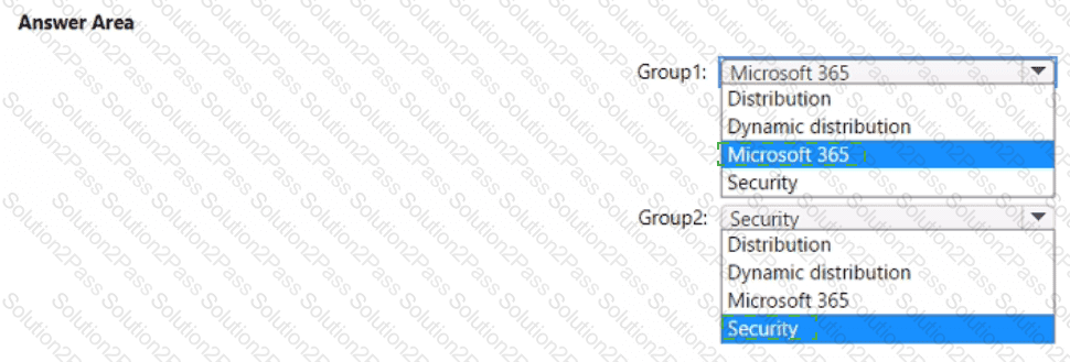 Which types of groups should you create? To answer, select the appropriate options in the answer area. NOTE: Each correct selection is worth one point.