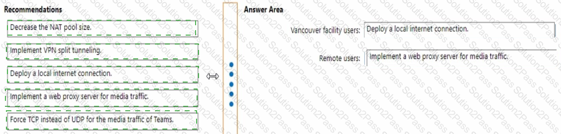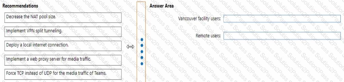 What should you recommend for the Vancouver facility users and the remote sale team users? To answer, drag the appropriate recommendation to the correct users. Each recommendation may be used once, more than once, or not at all. Vou may need to drag the split bar between panes or scroll to view content