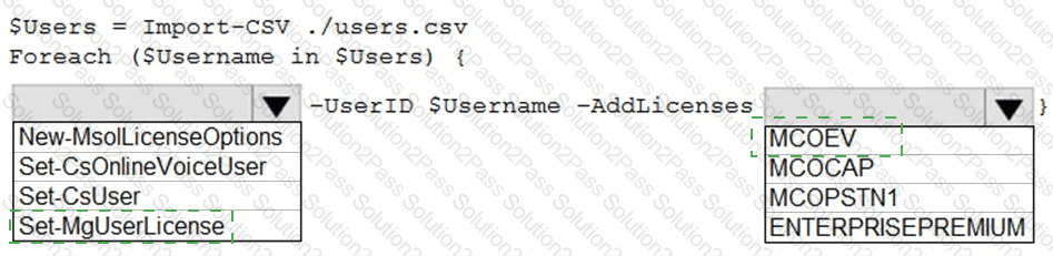How should you complete the PowerShell script? To answer, select the appropriate options in the answer area.