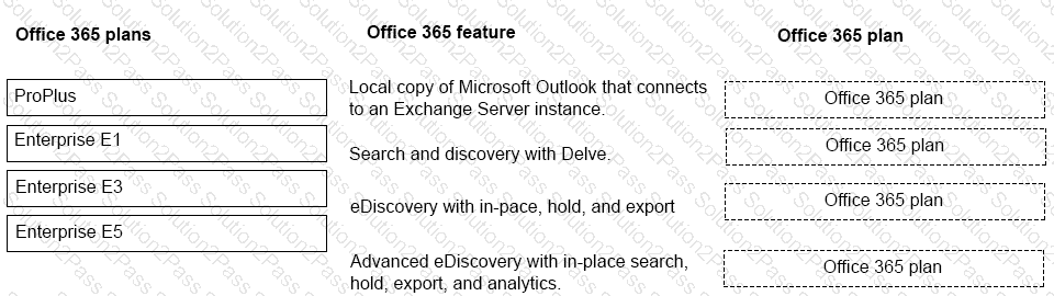 Which subscription plans should you recommend? Toanswer, drag the appropriate plans to the correct features. Each plan may be used once, more than once, or not at all.