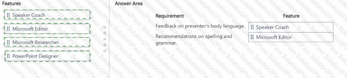 Which features should you recommend? To answer, drag the appropriate features to the correct requirements. Each feature may be used once, more than once, or not at all. You may need to drag the split bar between panes or scroll to view content.