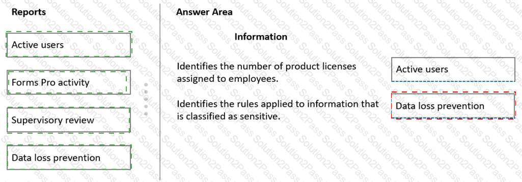 Which reports should you select? To answer, drag the appropriate reports to the correct type of information. Each report may be used once, more than once, or not at all. You may need to drag the split bar between panes or scroll to view content.