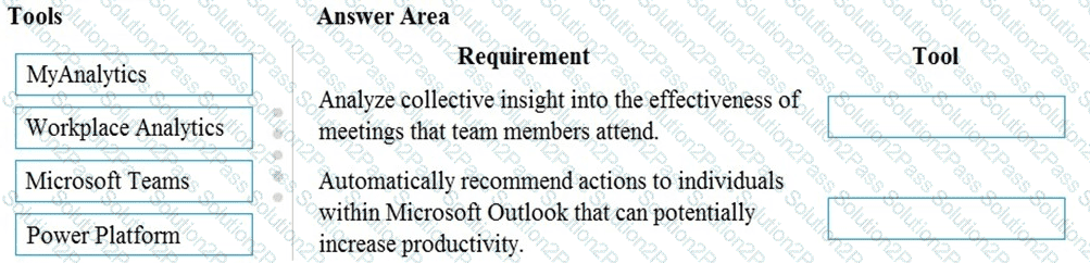 Which tool should you identifyfor each requirement? To answer, drag the appropriate tools to the correct requirements. Each tool may be used once, more than once, or not at all. You may need to drag the split bar between panes or scroll to view content.