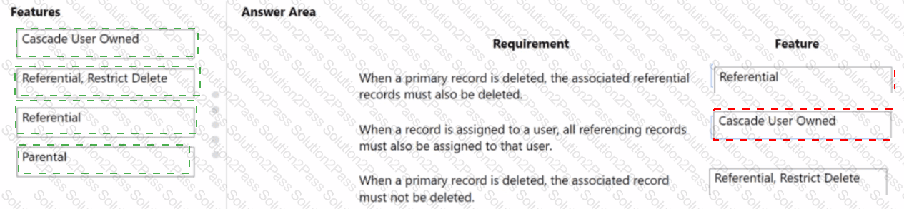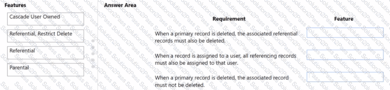Which features should you select? To answer, drag the appropriate features to the correct requirements. Each feature may be used once, more than once, or not at all. You may need to drag the split bar between panes or scroll to view content.