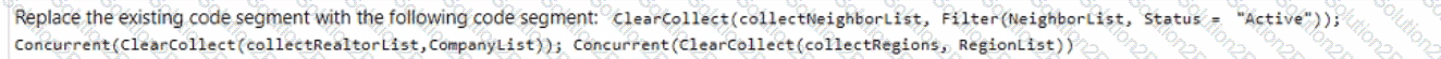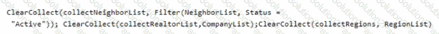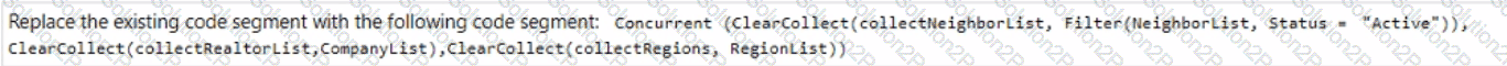 You are creating a canvas app that realtors use to identify neighbors for properties that are for sale. The OnStart property includes the following code: