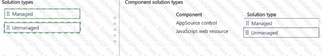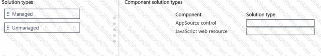 Which solution type should you use? To answer, move the appropriate solution types to the correct components. You may use each solution type once, more than once, or not at all. You may need to move the split bar between panes or scroll to view content.