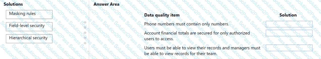 What should you recommend? To answer, drag the appropriate solutions to the correct data quality items. Each solution may be used once, more than once, or not at all. You may need to drag the split bar between panes or scroll to view content