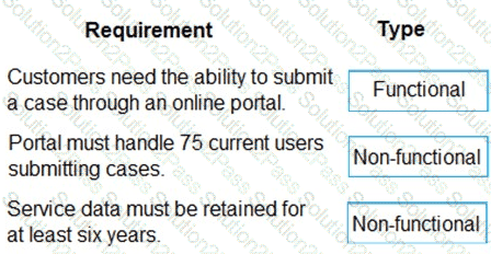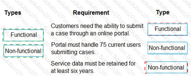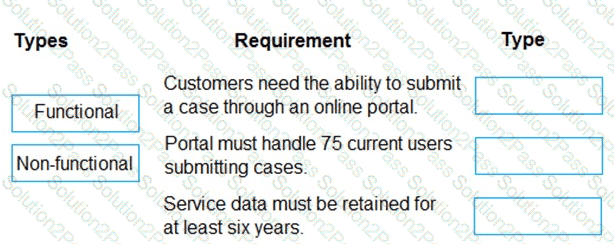 Which requirements are functional or non-functional? To answer, drag the appropriate types to the correct requirements. Each type may be used once, more than once, or not at all. You may need to drag the split bar between panes or scroll to view content.