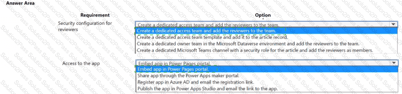 A company uses Power Pages for article submissions. The article properties are stored in a table in Microsoft Dataverse and the content of the article is stored in a related Microsoft SharePoint library. The company invites different experts outside its organization to review an article before publishing it. The reviewers are granted access to the articles in Microsoft Dataverse. The company has the following requirements: