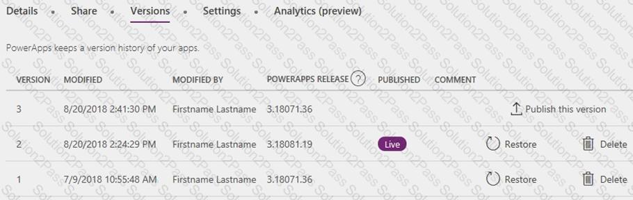 You have a Power Apps app. You create a new version of the app and then publish the new version. A customer goes through the process of restoring the previous version of the app. In the Version tab for the app, you will see two versions of the app.